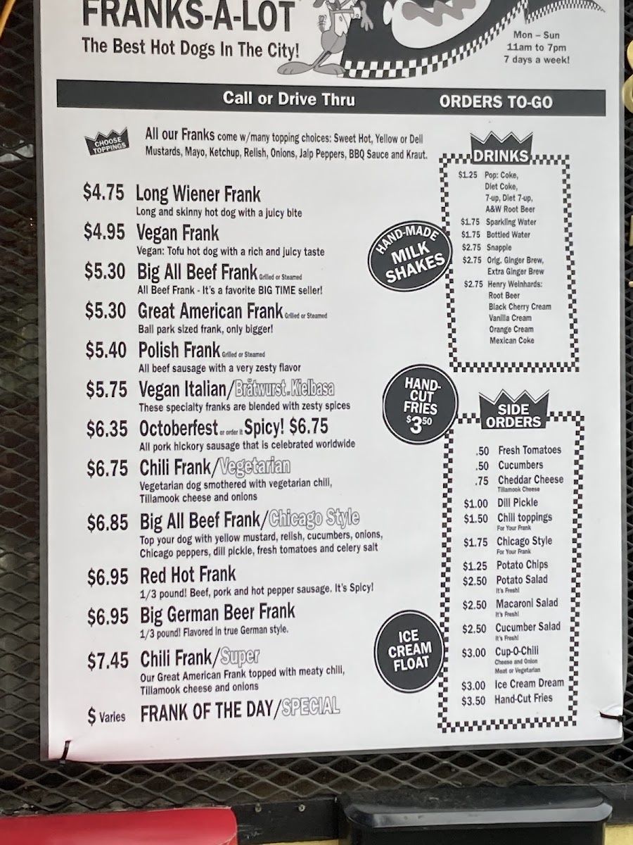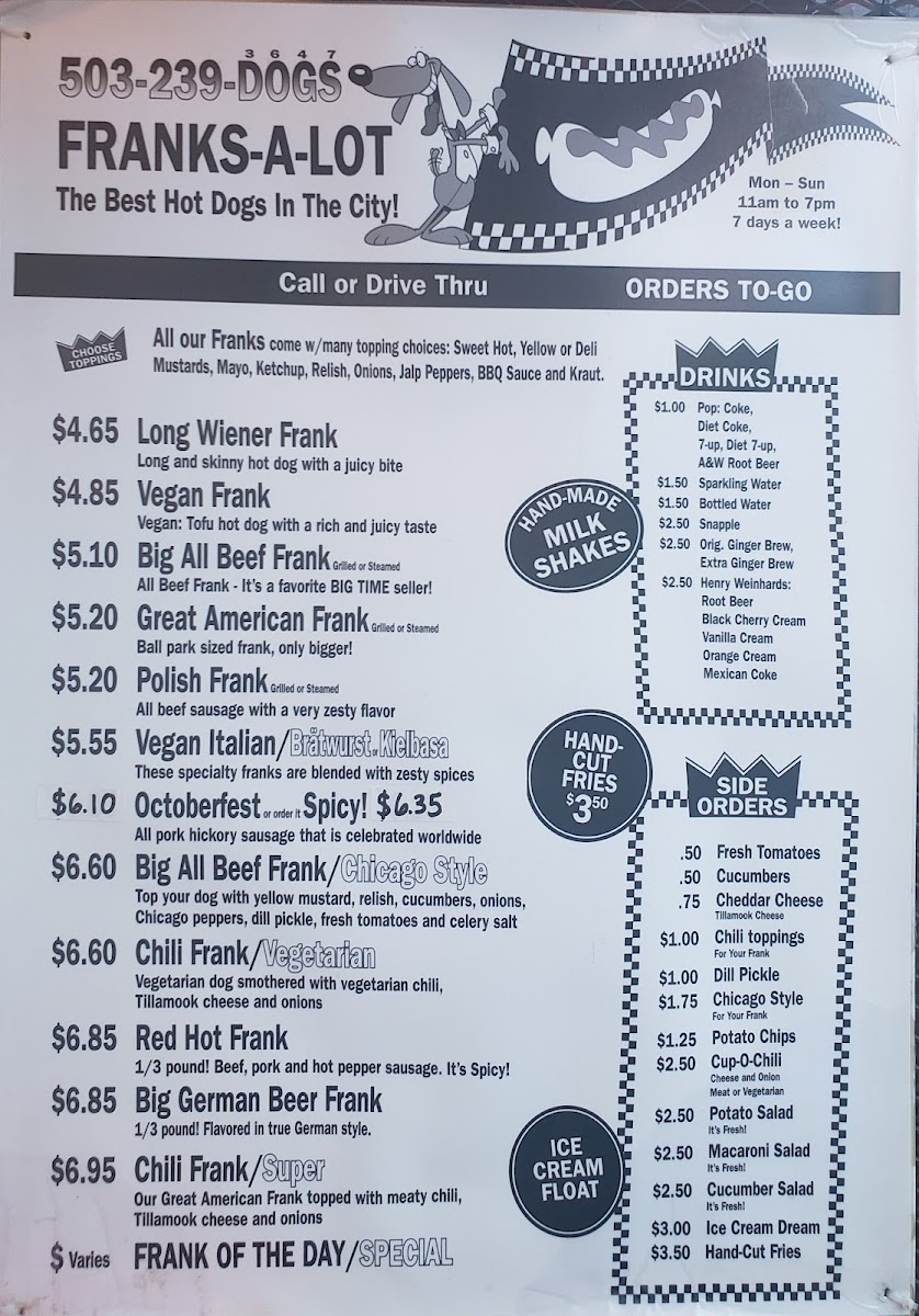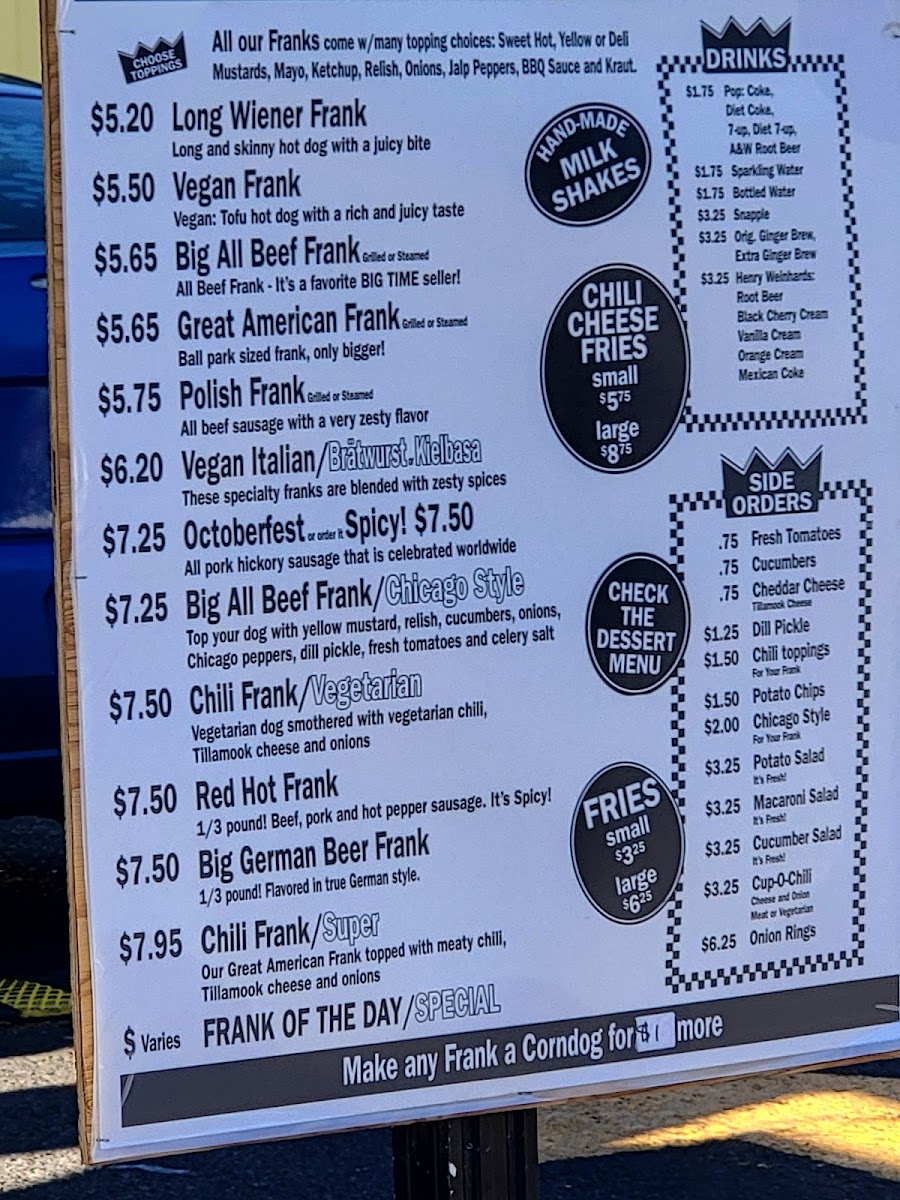 Franks A Lot offers a straightforward, casual menu focused on classic and comforting hot dog creations, with a friendly nod to both traditional and plant-based preferences. Here you’ll find a variety of all-beef and vegan dogs, alongside sides like fresh cut fries, onion rings, and potato salad—perfect for those moments when you want a satisfying, no-fuss bite.